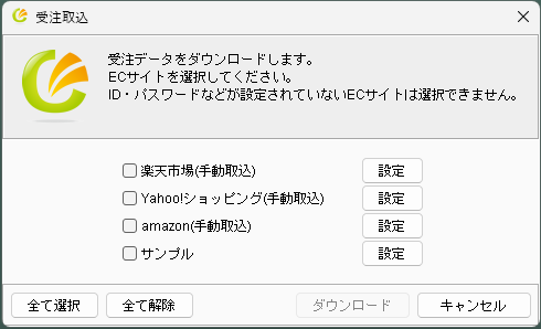 受注を取り込みたいECサイトにチェックを入れて、[ダウンロード]ボタンをクリック!これだけ!