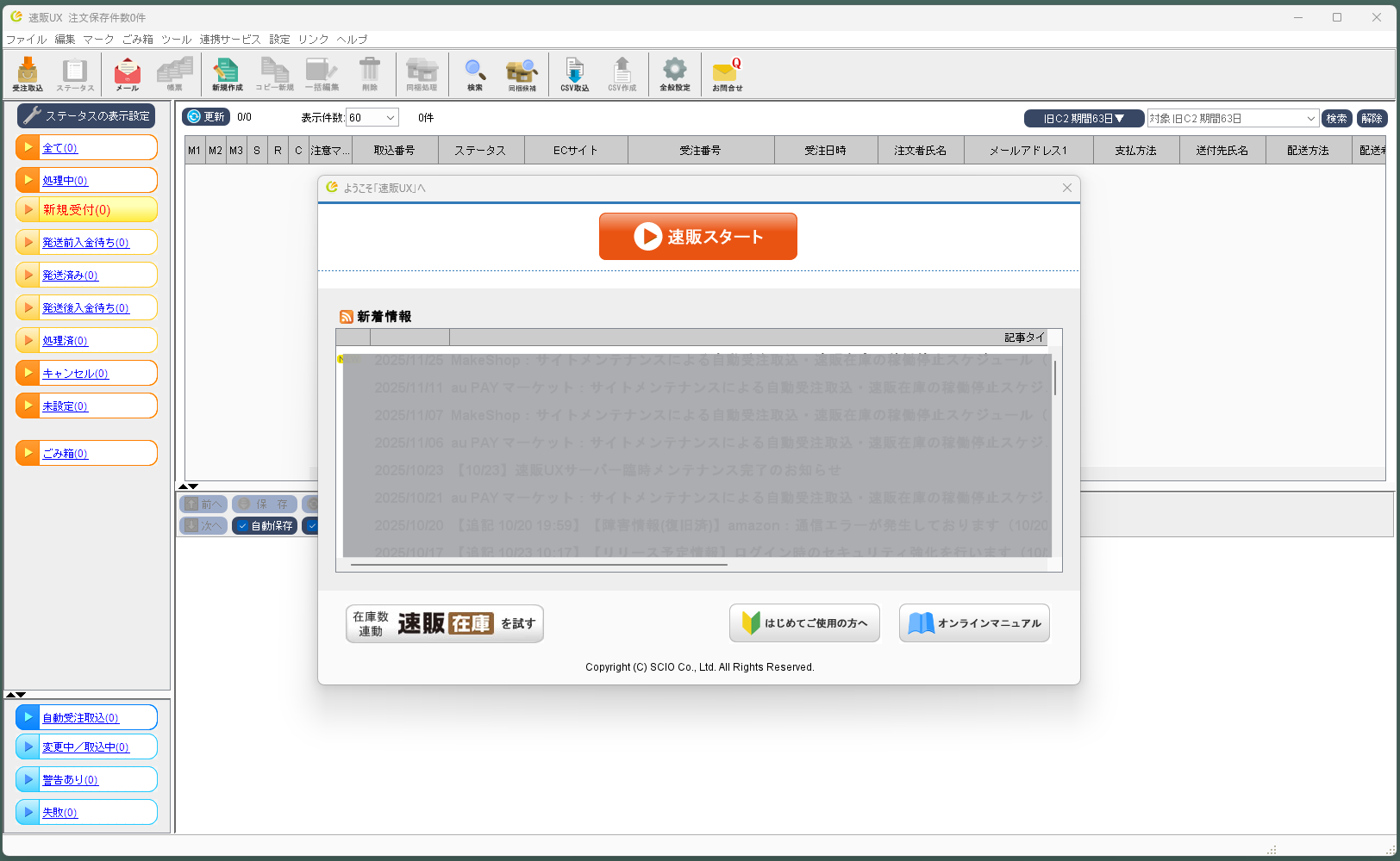 速販の画面の上に、「ようこそ!速販UXへ」というダイアログが表示されています。