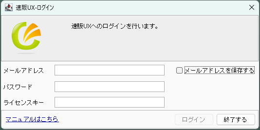 準備ができると、ログインダイアログが表示されます。速販を起動するためには、3つの欄への入力が必要です。