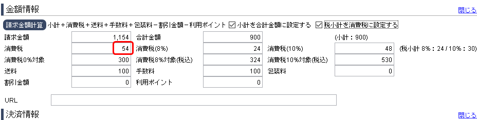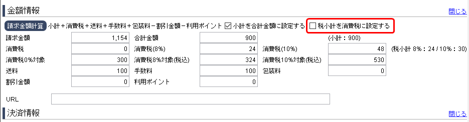楽天市場の受注データの詳細画面内の金額情報欄には、「税小計を消費税に設定する」チェックボックスがあります。デフォルトはチェック無しです。