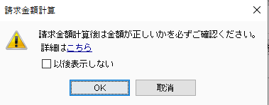 「請求金額計算」ボタンをクリックした際には、下記警告ダイアログが表示されます。
