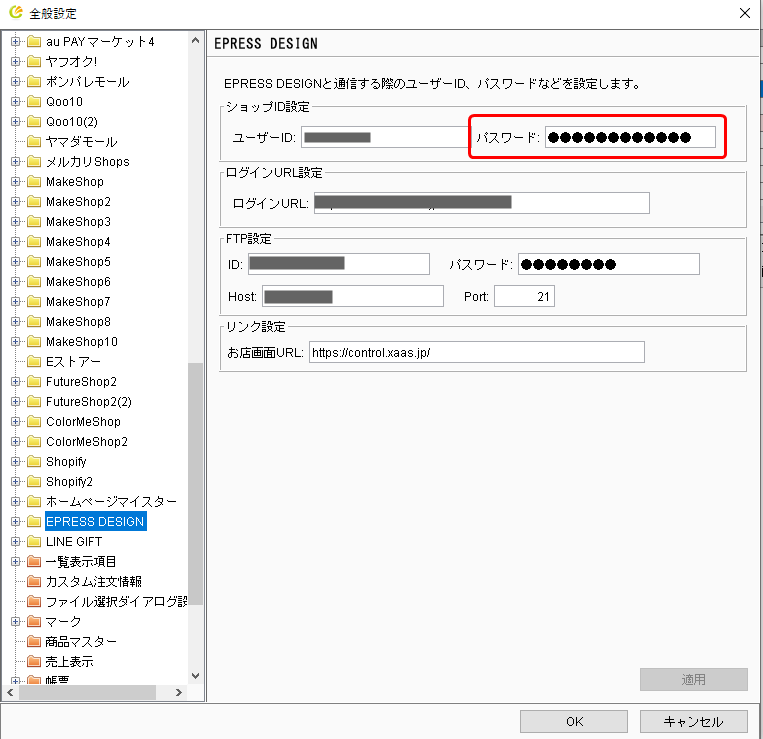 設定箇所:【全般設定>EPRESS DESIGN(ホームページマイスター)」の、ショップID設定の「パスワード」